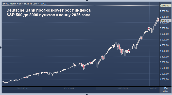 Deutsche Bank опубликовал прогноз, согласно которому индекс S&P 500 к концу следующего года достигнет 8000 пунктов. Такой рост обусловлен высокими корпоративными доходами и развитием технологий искусственного интеллекта. Это делает прогноз банка одним из самых оптимистичных среди крупнейших мировых брокерских компаний.