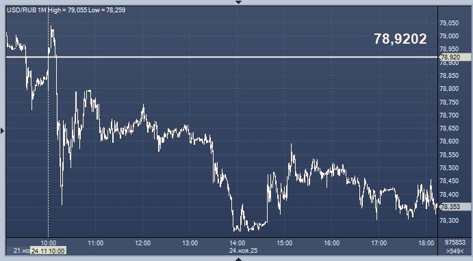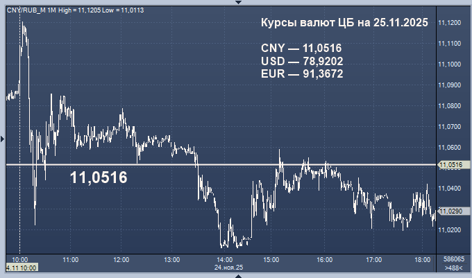 Китайский юань умеренно снизился на Московской бирже в понедельник и торгуется чуть выше отметки 11 рублей; рубль укрепляется на биржевых торгах 24 ноября, отыгрывая как улучшение внешнего геополитического фона, так и приближающийся налоговый период ноября, пишет Интерфакс.