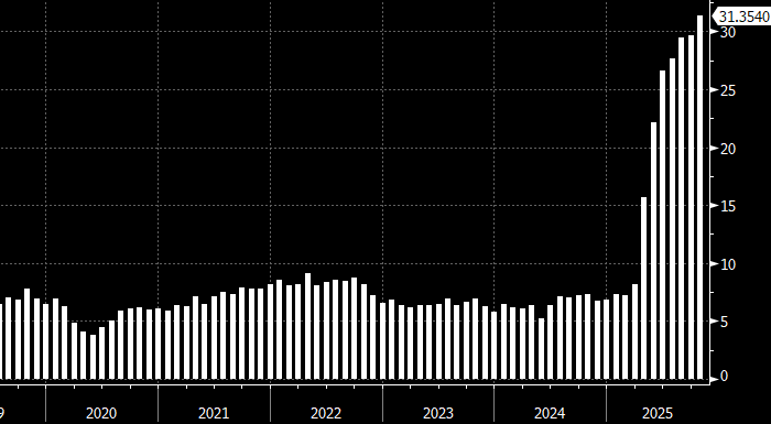 Чистые таможенные пошлины стали одним из крупнейших источников наполнения бюджета в октябре, достигнув нового рекордного месячного показателя в $31,4 млрд (см. график выше). Цифра превысила предыдущий рекорд в $29,7 млрд, установленный в сентябре, и более чем в четыре раза — показатель октября 2024 года на уровне $7,3 млрд.