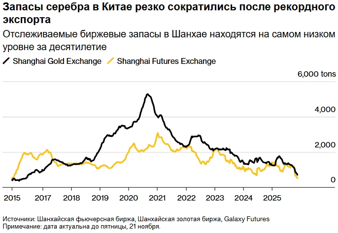 Согласно данным Шанхайской фьючерсной биржи и брокерских компаний, запасы серебра на складах, связанных с этой биржей, достигли самого низкого уровня с 2015 года. Объёмы торгов на Шанхайской бирже золота также упали до минимальных показателей за последние девять лет. Экспорт драгоценного металла из Китая в октябре достиг рекордных 660 тонн.