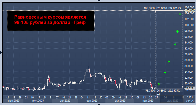 Президент - председатель правления Сбербанка Герман Греф считает, что курс в диапазоне 98-105 рублей за доллар является равновесным и выгодным для экспортеров и импортеров.