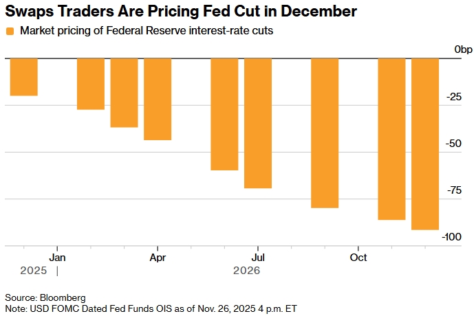 Участник рынка свопов оценивают снижение ставки ФРС в декабре. Рыночное ценообразование снижения процентных ставок Федеральной резервной системы. Источник: Блумберг. Примечание: FOMC датирует ставку доллара США по федеральным фондам OIS по состоянию на 26 ноября 2025 г., 16:00 по восточному времени.