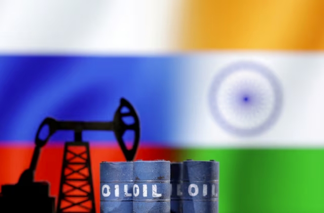 На этой иллюстрации, сделанной 9 декабря 2022 года, на фоне российского и индийского флагов видна модель нефтяного насоса и домкрата. REUTERS/Dado Ruvic