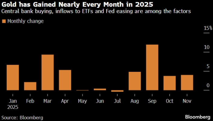 В текущем году драгоценные металлы демонстрируют устойчивый рост почти каждый месяц, приближаясь к лучшим показателям с 1979 года. Центральные банки активно покупают золото, а приток несуверенных средств в биржевые инвестиционные фонды способствует рекордным ценам выше 4380 долларов в прошлом месяце. Инвесторы ищут альтернативные активы на фоне оттока средств из государственных облигаций и валют.