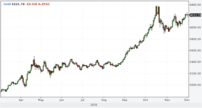 Золото, вероятно, будет торговаться в диапазоне $4000–4200 за тройскую унцию в текущем декабре, полагают аналитики SberCIB Investment Research.