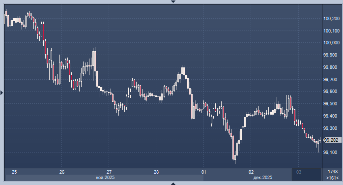Индекс доллара, отражающий курс американской валюты по отношению к шести другим валютам, снизился на 0,1% до 99,202, что означает почти 9% падение за год.