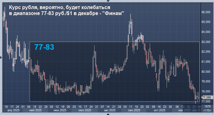 "Что касается прогноза на декабрь, то все действующие ноябрьские факторы сохранят свое влияние. 19 декабря состоится последнее в 2025 году заседание ЦБ РФ по ключевой ставке. По всей видимости, регулятор может еще раз снизить ставку на 0,5% - до 16% годовых. Но этого будет недостаточно, чтобы ослабить позиции рубля, - отмечает эксперт в комментарии. - В текущем месяце ожидаются сезонно повышенные бюджетные расходы, часть денег из которых может пойти на закупку импорта, что может, как минимум, остановить укрепление рубля. Поэтому мы ожидаем, что пара USD/RUB в декабре, вероятно, будет торговаться в диапазоне 77-83 руб./$1".