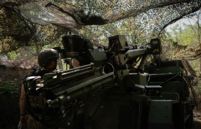 Украинский солдат чистит казенную часть самоходной артиллерийской установки вблизи восточной линии фронта Украины. Фотограф: Флоран Вернь/AFP/Getty Images