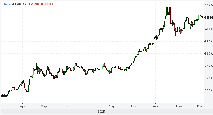 Спотовые цены на золото упали на 0,5% до 4179,71 доллара за унцию по состоянию. Фьючерсы на золото в США с поставкой в декабре снизились на 0,5% до 4210,20 доллара за унцию.