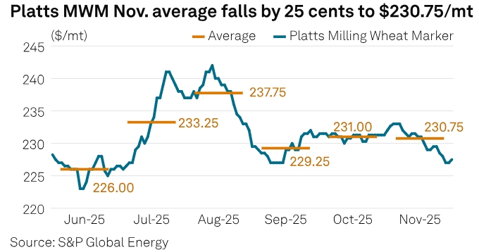 Фьючерсный индекс Platts на пшеницу упал до самого низкого уровня с середины сентября, составив 227,50 долл. США/т для поставок с конца декабря по первую половину января 1 декабря, поскольку продавцы продолжают снижать свои предложения.