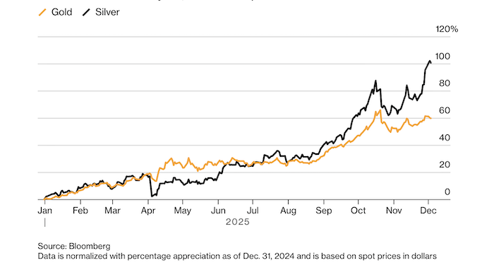 Часто серебро движется в тандеме с золотом, но с более резкими колебаниями. После того как в начале 2025 года золото взлетело в цене, многие инвесторы обратили внимание на исторически высокое соотношение цен двух металлов, которое превышало 100 к 1. На фоне золота серебро выглядело откровенно дешевым, что и побудило многих вложиться в «белый металл».