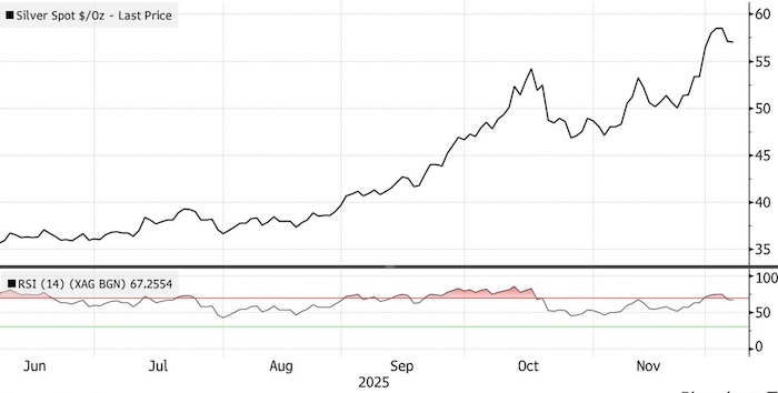 «Белый металл» упал ниже отметки в $57 за унцию, потеряв более 2% на предыдущей сессии и прервав восьмидневную серию роста. Последний откат вывел серебро из зоны «перекупленности», в которую он попал после стремительного взлета почти до $59 в среду. 14-дневный индекс относительной силы (RSI) опустился ниже порога в 70 пунктов (рост выше этой отметки обычно сигнализирует о том, что восходящая динамика была слишком сильной и слишком быстрой).