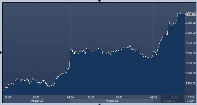 Индекс МосБиржи превысил отметку в 2700 пунктов в пятницу днем, достигнув максимума с 24 ноября, что произошло на фоне ожиданий прогресса в мирном урегулировании конфликта вокруг Украины, как сообщает Интерфакс. К 12:31 по московскому времени индекс МосБиржи поднялся до 2700,69 пункта (+1,6%), а индекс РТС вырос до 1105,32 пункта (+1,6%).