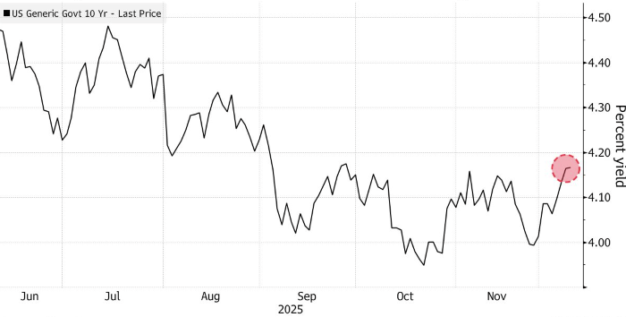 Доходность 10-летних казначейских облигаций США уже выросла более чем на 20 базисных пунктов с октябрьских минимумов, что является необычным явлением, учитывая, что ФРС, вероятно, на этой неделе снова снизит процентную ставку на четверть пункта.
