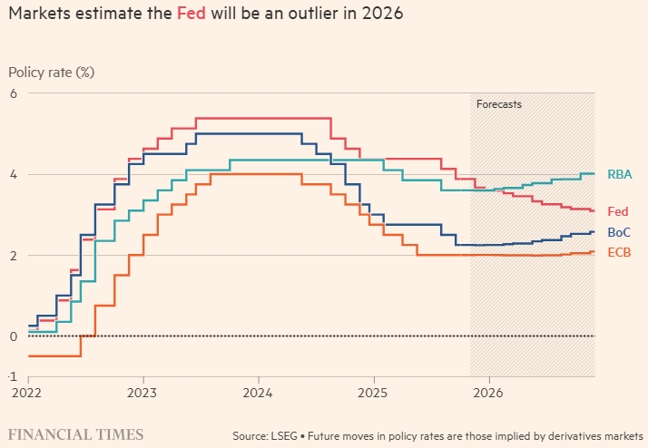 Рынки прогнозируют, что ФРС будет выбиваться из общей картины в 2026 году. Денежная ставка (%). РБА, ФРС, Банк Канады, ЕЦБ. FT. Источник: LSEG. Будущие изменения процентных ставок определяются рынками деривативов.
