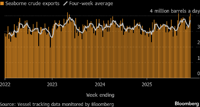 Желтым — морской экспорт нефти из РФ, белым — среднее четырехнедельное значение. Источник: Bloomberg