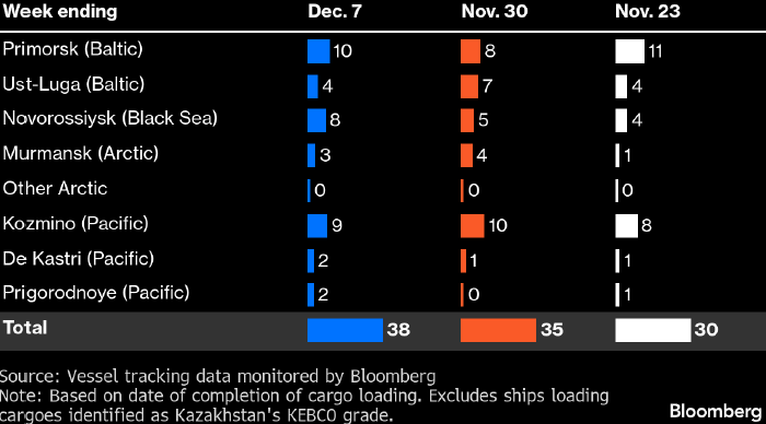 Число танкеров, загруженных в российских портах. Источник: Bloomberg