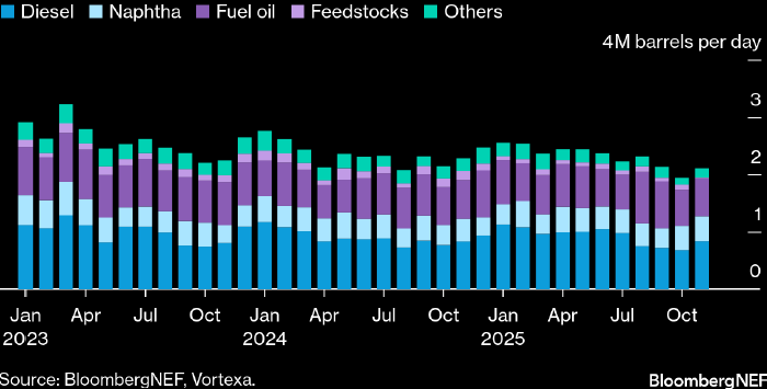 Экспорт нефтепродуктов из России по видам в млн б/д. Источник: Bloomberg, Vortexa