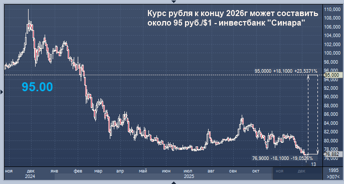 Курс валютной пары доллар/рубль к концу следующего года может быть около уровня в 95 руб./$1, средний курс - 90 руб./$1, считает главный экономист инвестиционного банка "Синара" Сергей Коныгин.