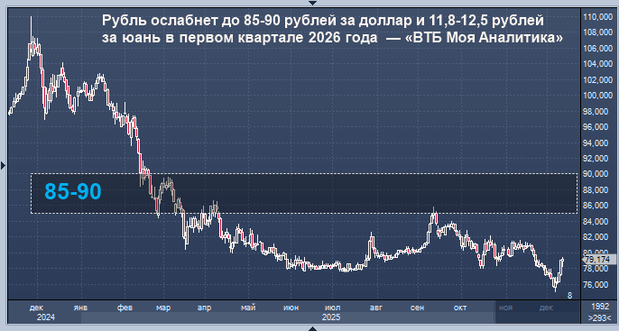 "Курс CNY/RUB за последние четыре дня поднялся от 10,7 руб. за юань. Причина может быть как в том, что рынок начинает реагировать на прошедшее снижение цены нефти, так и в том, что инвесторы стали закладывать в котировки предстоящее в 2026 году значительное сокращение продаж валюты со стороны ЦБ РФ. Мы полагаем, что курс USD/RUB вырастет до 85-90 руб./$1 в первом квартале следующего года, курс CNY/RUB - до 11,8-12,5 руб. за юань", - пишут эксперты.