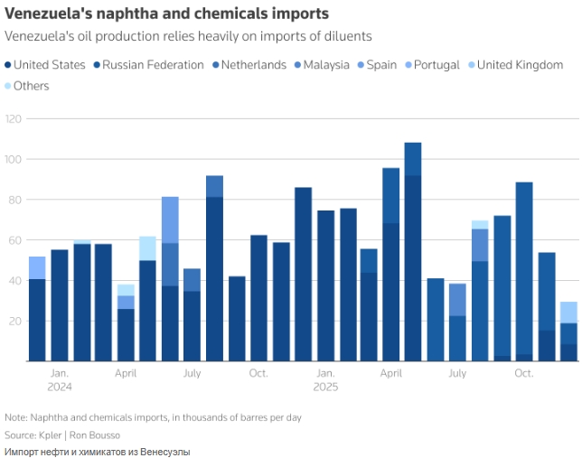 По прогнозам Kpler, импорт нафты и химикатов в Венесуэлу в декабре сократится до 39 000 баррелей в сутки против 54 000 баррелей в ноябре и 89 000 баррелей в октябре.
