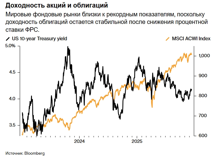 После снижения процентных ставок ФРС 10 декабря индекс MSCI All Country World Index, охватывающий мировые фондовые рынки, достиг исторического максимума. Индексы S&P 500 и Nasdaq 100 также выросли в 2025 году благодаря энтузиазму вокруг искусственного интеллекта и ожиданиям смягчения денежно-кредитной политики.