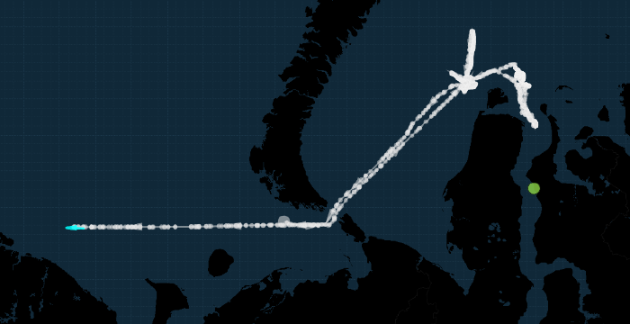 Маршрут газовоза «Буран» (белым) во время недавней попытки забрать продукцию с завода «Арктик СПГ 2» (салатовая точка). Источник: Bloomberg