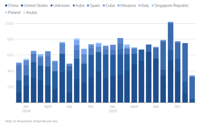 Теперь же, по данным аналитической компании Kpler, в декабре экспорт венесуэльской нефти, по прогнозам, упадет до 702 000 баррелей в день — самого низкого показателя с мая. Тем временем, появляются признаки того, что азиатские покупатели требуют все больших скидок на венесуэльскую нефть, чтобы компенсировать растущие торговые риски.
