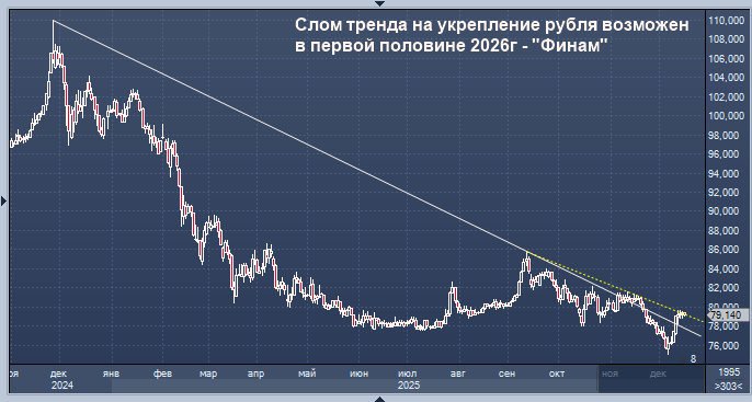 Слом тренда на укрепление рубля возможен в первой половине 2026 года, говорится в материале аналитика "Финама" Александра Потавина.