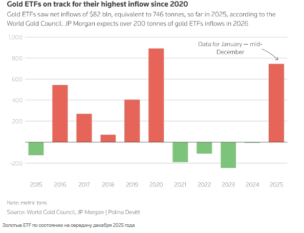 JP Morgan прогнозирует, что для поддержания текущих цен на золото необходим ежеквартальный спрос со стороны центральных банков и инвестиционных компаний в размере около 350 метрических тонн. В 2026 году этот показатель может вырасти до 585 тонн в квартал.