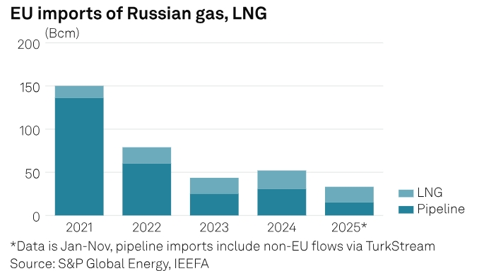 Согласно оценкам Platts, за первые 11 месяцев 2025 года импорт российского газа в Европу по трубопроводу «Турецкий поток» — единственному оставшемуся действующим трубопроводу между регионами — составил 15,2 млрд кубометров. В эту цифру входят поставки в страны, не входящие в ЕС, такие как Сербия и Босния и Герцеговина.