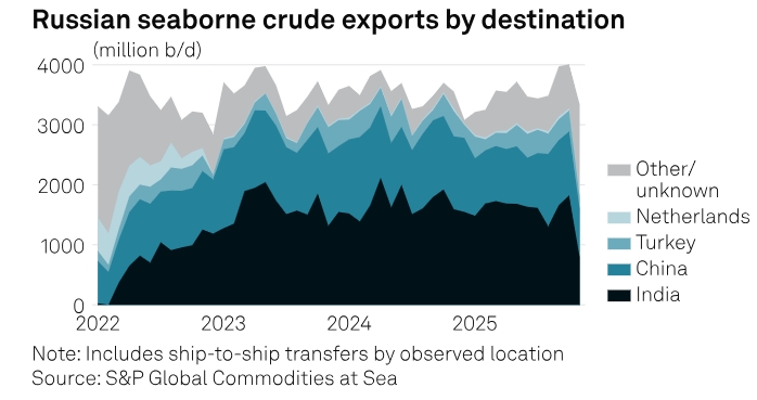 - С 2022 года Россия перенаправила значительные объемы нефти и нефтепродуктов с традиционных рынков Европы в страны, не подпадающие под санкции, в первую очередь в Китай и Индию.