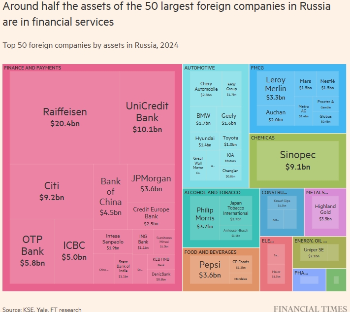 Примерно половина активов 50 крупнейших иностранных компаний в России приходится на финансовые услуги. 50 крупнейших иностранных компаний по активам в России, 2024 год. Источник: KSE, Йельский университет (признан в РФ нежелательной организацией.), исследования FT.