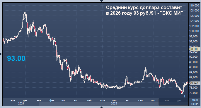 Средний курс доллара составит в следующем году 93 руб./$1, говорится в стратегии аналитиков "БКС Мир инвестиций" на 2026 год.