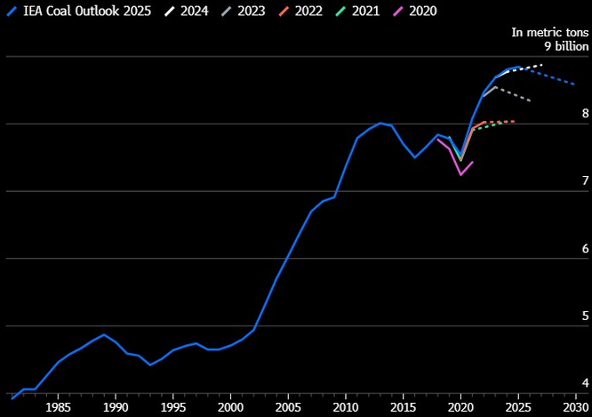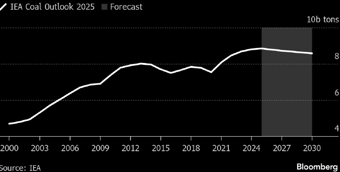 Мировой спрос на уголь вырастет в текущем году на 0,5% г/г до 8,845 млрд тонн, пишет стратег Bloomberg Хавьер Блас со ссылкой на оценки Международного энергетического агентства. Кроме того, МЭА пересмотрело вверх аналогичные цифры за 2024 год.