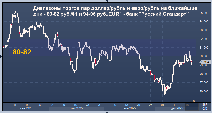 Прогнозные диапазоны для валютных пар доллар/рубль и евро/рубль на ближайшие дни составляют 80-82 руб./$1 и 94-96 руб./EUR1 соответственно, говорится в комментарии директора департамента операций на финансовых рынках банка "Русский Стандарт" Максима Тимошенко.