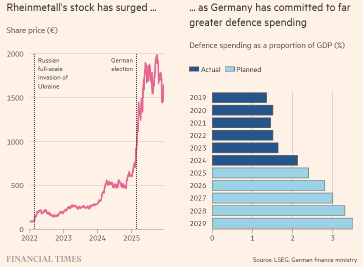 Решение канцлера Германии Фридриха Мерца о выделении сотен миллиардов евро на военные расходы сделало Rheinmetall одним из лидеров роста по индексу Stoxx Europe 600. Акции компании, производящей танки и боеприпасы, выросли на 154% после начала конфликта России и Украины.