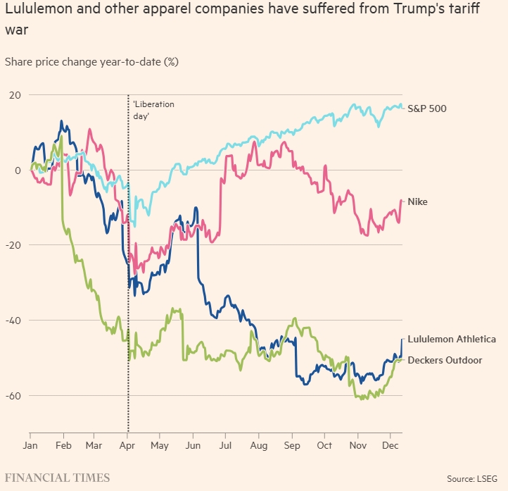 Акции премиального ретейлера спортивной одежды Lululemon потеряли почти половину своей стоимости, несмотря на временный подъём в середине декабря, вызванный новостями об уходе генерального директора. Несмотря на статус производителя высококачественных леггинсов для йоги, оцениваемого в 25 миллиардов долларов, компания пострадала от тарифов Трампа, роста цен на американском рынке и усиления конкуренции.