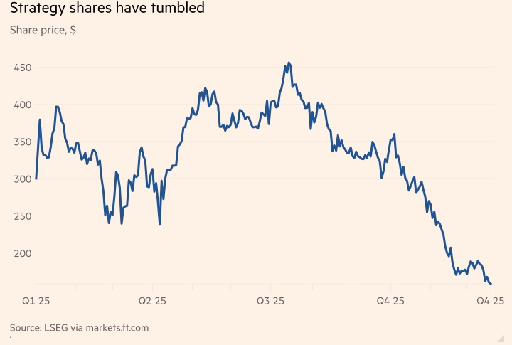 Крупнейший в мире корпоративный держатель биткоинов пережил тяжёлый год. В первой половине 2025 года акции компании резко выросли, что вдохновило сотни других компаний на копирование её модели привлечения средств с долговых и долевых рынков для покупки криптовалюты. Однако устойчивость этой модели оказалась под угрозой из-за падения цены биткоина. Акции компании достигли самого низкого уровня с октября 2024 года.