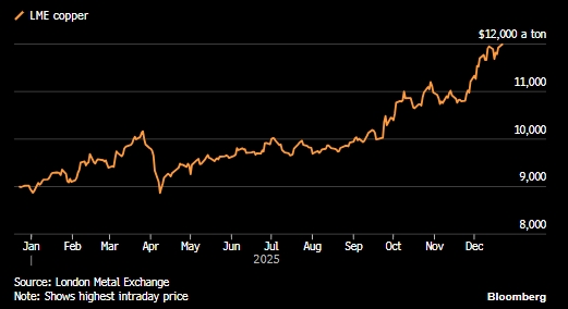 Цена меди достигла нового рекордного уровня и приблизилась к отметке в 12 000 долларов за тонну в конце года, омраченного торговыми потрясениями, дефицитом предложения и оптимистичными перспективами долгосрочного спроса.