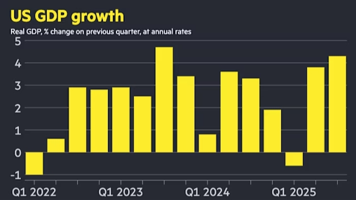 Во вторник были обнародованы официальные данные, согласно которым экономика США в третьем квартале выросла на 4,3 % в годовом выражении, значительно превысив ожидания экспертов и показав лучший результат за последние годы.
