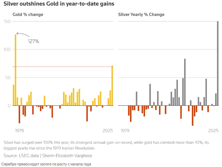 Серебро за тот же период подскочило более чем на 150%, обогнав золото благодаря сильному инвестиционному спросу, включению в список критически важных минералов США и покупкам на импульсе.