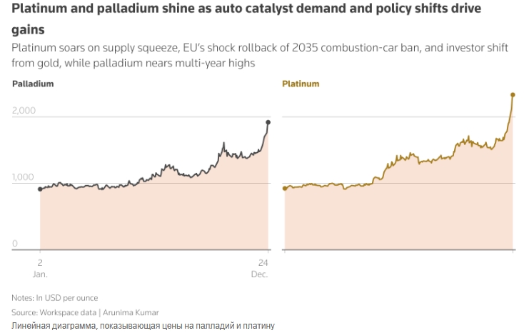 Золото и серебро «резко набрали обороты» на этой неделе, достигнув новых рекордных максимумов, что отражает их привлекательность как средств сохранения стоимости на фоне ожиданий снижения процентных ставок в США и глобального долга, сказал Тим Уотерер, главный аналитик рынка в KCM Trade. Платина и палладий, используемые в основном в автомобильных каталитических нейтрализаторах, резко выросли в этом году из-за дефицита предложения на рудниках, неопределенности тарифов и переориентации инвестиционного спроса с золота: цена платины увеличилась примерно на 160%, а палладия — более чем на 100% с начала года.