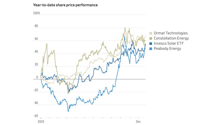 Взять, к примеру, акции компаний из сектора возобновляемой энергетики. Год для них начался слабо из-за угрозы сокращения субсидий. Но как только ситуация прояснилась, сектор начал восстанавливаться, а затем инвесторы устроили «догоняющую торговлю», делая ставку на растущие энергозатраты ИИ. В результате ETF на чистую и солнечную энергию с начала года взлетели на 60 и 50% соответственно. В эту волну попали все: акции геотермальной компании Ormat Technologies выросли на 65%, а канадский производитель урана Cameco — на 80%.
