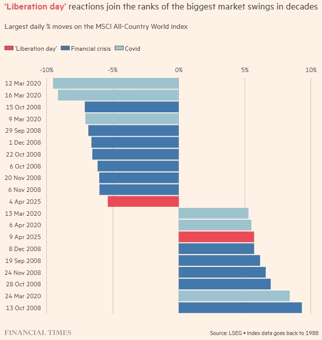 Реакции на «День освобождения» пополнили ряды самых масштабных рыночных колебаний за последние десятилетия.Наибольшие дневные процентные изменения индекса MSCI All-Country World. «День освобождения». Финансовый кризис.COVID-19. Источник: LSEG. Данные индекса доступны с 1988 года. FT