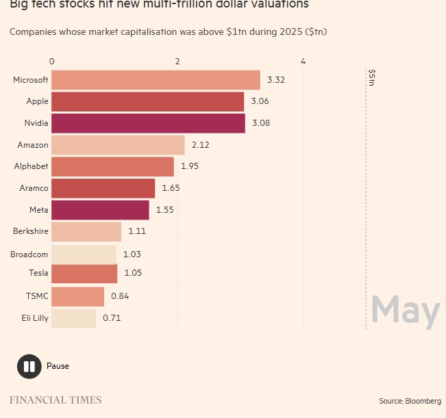 Акции крупных технологических компаний достигли новых многотриллионных рыночных показателей. Компании, рыночная капитализация которых в 2025 году превышала 1 трлн долларов (трлн долларов). Источник: Блумберг. FT (компания Meta признана экстремистской, ее деятельность в России запрещена)
