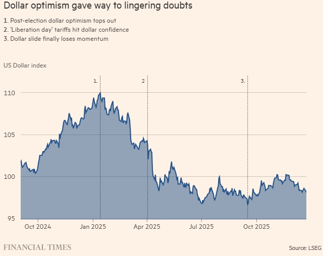 Оптимизм в отношении доллара сменился затаенными сомнениями. 1. После выборов оптимизм в отношении доллара достиг своего пика. 2. Тарифы, введенные в «день освобождения», подорвали доверие к доллару. 3. Падение доллара наконец-то замедлилось. Индекс доллара США. FT. Источник: LSEG