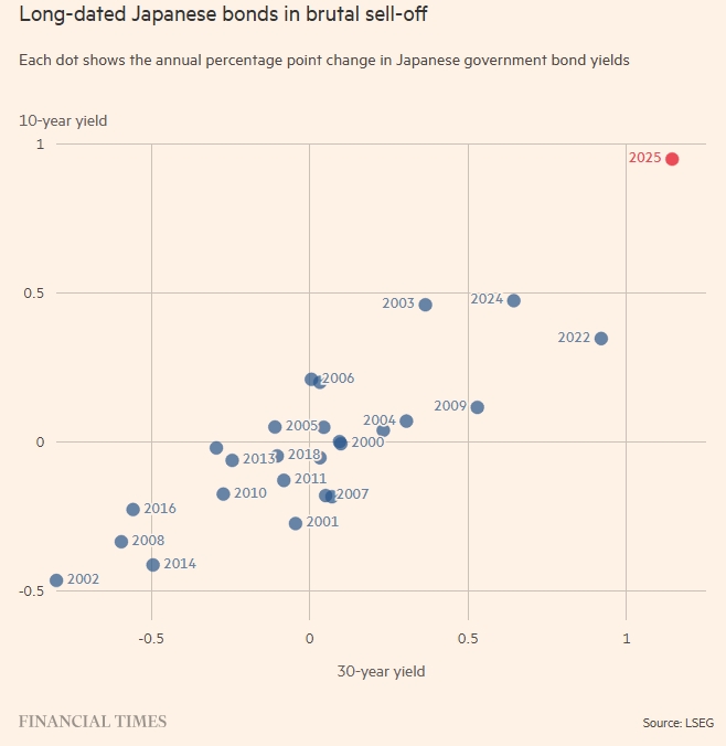 Долгосрочные японские облигации подверглись резкой распродаже. Каждая точка показывает годовое изменение доходности государственных облигаций Японии в процентных пунктах. 10-летняя доходность. 30-летняя доходность. FT. Источник: LSEG