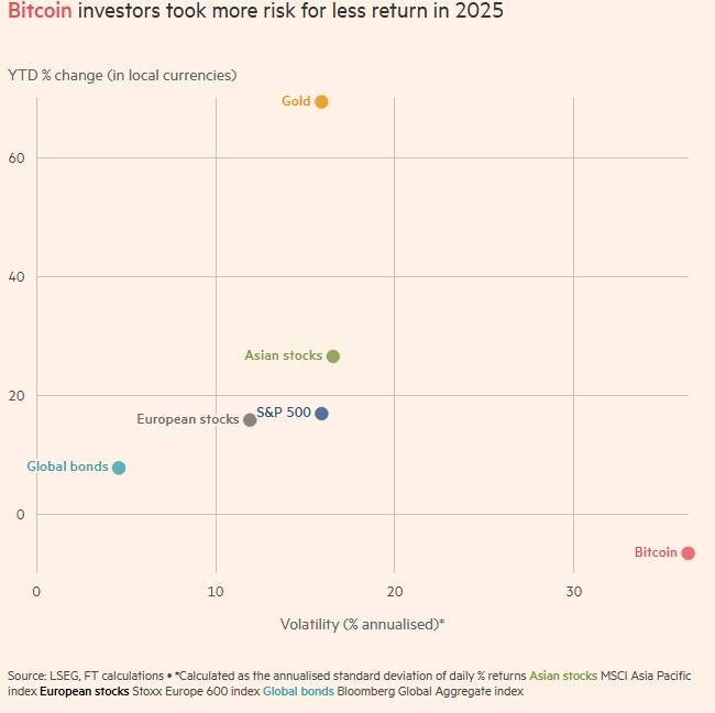 В 2025 году инвесторы в биткоин пошли на больший риск, получив меньшую прибыль. Изменение с начала года в процентах (в местных валютах). Золото. Азиатские акции. Европейские акции. S&P 500. Глобальные облигации. Биткоин. Волатильность (% в годовом исчислении)* Источник: LSEG, расчеты FT.