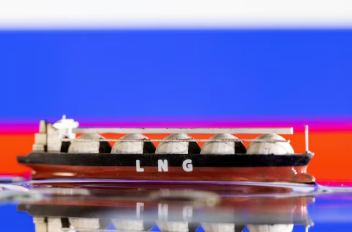 На иллюстрации, сделанной 19 мая 2022 года, модель танкера СПГ видна на фоне российского флага. REUTERS/Dado Ruvic